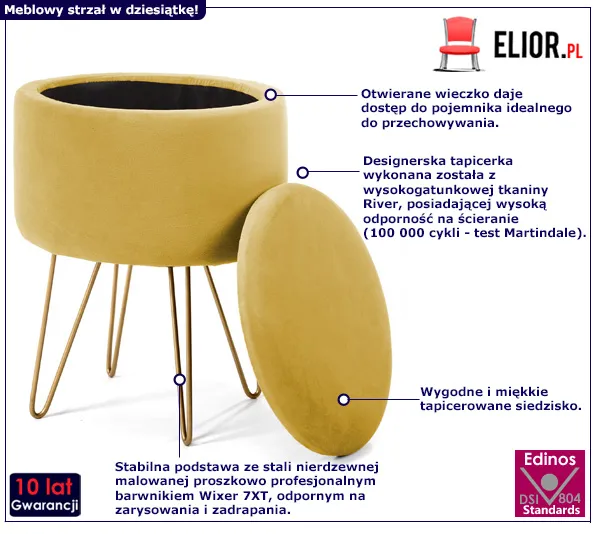 Pufa Hagos marki Edinos Premium zaprojektowana została z zastosowaniem materiałów najlepszej jakości. Designerska tapicerka to wysokogatunkowa tkanina River - gęsta i aksamitna tkanina obiciowa typu velvet. Materiał ten jest niesamowicie miękki i aksamitny w dotyku. River to jeden z francuskich welurów posiadający bardzo dobrą odporność na ścieranie (do 100 000 cykli - test Martindale). Już nie musisz się martwić, że rozlana kawa spowoduje konieczność wymiany mebla. Bogatą strukturę tapicerki wyśmienicie podkreśla designerska podstawa wykonana z najwyższej jakości profesjonalnej stali w efektownym złotym kolorze. Stal została poddana procesowi profesjonalnego chromowania, dzięki czemu uzyskała znacznie większą trwałość, odporność na korozję, chemikalia, wysoką temperaturę oraz uszkodzenia mechaniczne, niż produkty konkurencji. Zastosowanie tych odpornych na uszkodzenia materiałów znacząco wydłuża czas eksploatacji mebla, co pozwoli Ci cieszyć się jego wygodą przez długie lata. Sprawdź, jakiego blasku nabierze Twój salon z pufą Hagos marki Edinos Premium!
