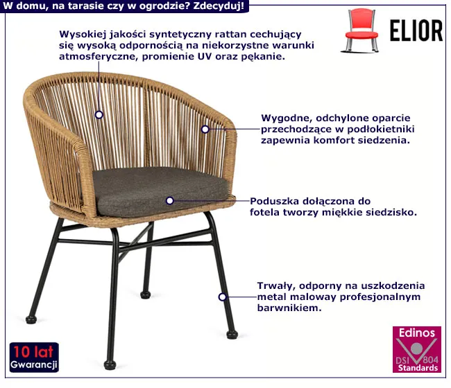 Jestem zadowolony z zakupu, ale krzesło ma kilka drobnych minusów. Rattanowe wykończenie wygląda pięknie i nadaje wnętrzu przytulny charakter, jednak poduszka mogłaby być nieco grubsza,cała reszta bez uwag