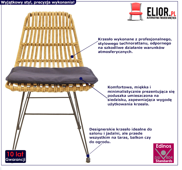 Urzekające naturalnym wdziękiem krzesło Ruler jest meblem, które cechuje trwałość, stabilność i dokładne wykonanie. Jest to zasługa profesjonalnie dobranych i niezwykle wytrzymałych materiałów meblarskich. Dzięki nim zachwycające designerską pogodą krzesło Ruler użytkuje się naprawdę wygodnie, przyjemnie i co istotne – bez uszkodzeń przez wiele lat. Do produkcji pięknego krzesła Ruler wykorzystano nowoczesne surowce o wysokiej klasie. Są to: profesjonalny technorattan odporny na szkodliwe działanie czynników zewnętrznych i odporny na zarysowania oraz wysokogatunkowa, miękka tkanina o szlachetnych ultramikrowłóknach, odporna na zabrudzenia. Technorattan jest niezwykle wytrzymałym materiałem meblowym, zapewniającym stabilność oraz designerski, ponadczasowy design krzesła ogrodowego. To niezwykle istotne, by meble, w które inwestujemy, cechowało wytrzymałe, staranne wykonanie. Na szczęście z modernistycznie zaprojektowanym krzesłem Ruler w boho wydaniu nie trzeba się o to martwić! Stylowe i pełne minimalistycznego wdzięku krzesło Ruler wciąż cieszy oko niebywałym szykiem. Ten mebel posiada niezaprzeczalne zalety – trwałość, stabilność, dokładne wykonanie, funkcjonalizm i oczywiście jakże modną, innowacyjną prezencję. Chyba każdy przyzna, że warto mieć tak piękny i komfortowy model krzesła u siebie.