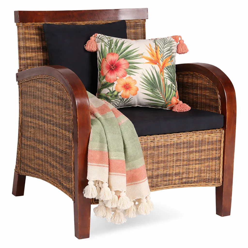 • tropikalny styl fotela doskonale komponuje się z różnorodnymi aranżacjami wnętrz, od klasycznych po współczesne, wnioskując elegancję i lekkość.