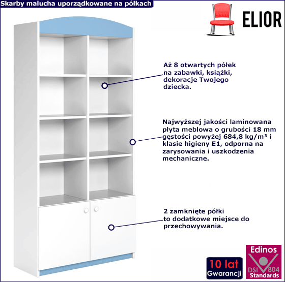 Twoja pociecha ma coraz więcej zabawek, książeczek, ubrań, a Ty zastanawiasz się gdzie to wszystko poukładać? Mamy dla Ciebie perfekcyjne wyjście z tej sytuacji. Od dzisiaj pokój Twojego malucha będzie super zorganizowany, w którym nie będzie miejsca na jakikolwiek rozgardiasz, a jednocześnie wszystko będzie w zasięgu ręki właściciela. Jak to możliwe? Z radością przedstawiamy Ci regał Rostok 5X - najnowsze dzieło projektantów marki Edinos Premium. Regał to mebel znany od pokoleń. Praktyczny, pojemny, świetnie sprawdzi się zarówno w pokoju malucha, jak i starszego dziecka. Nasz regał jest częścią fenomenalnej kolekcji mebli Happy, która jest dedykowana właśnie tym najmłodszym użytkownikom. Mebel posiada 8 otwartych i 2 zamknięte półki w których Twój maluch przechowa zabawki, dekoracje, a z czasem książki czy zeszyty. Rostok 5X to mebel z solidnych materiałów. Regał został wykonany z wysokogatunkowej płyty meblowej laminowanej o grubości 18 mm, klasie higieny E1 i podwyższonej gęstości około 684,8 kg/m3 wg badania normy EN 323. Wszystko to sprawia, że mebel prezentuje się niezwykle estetycznie, a do tego jest odporny na zarysowania i wszelkiego rodzaju uszkodzenia mechaniczne. Biały kolor regału to bardzo dobry wybór. Białe meble to doskonała propozycja zarówno do pokoju dziewczynki, jak i chłopca. Biały to ponadczasowy kolor, który cudownie rozświetla pomieszczenie i jest idealną bazą dla pozostałych kolorowych przedmiotów w pokoju Twojego dziecka. Producent marki Edinos Premium mając na uwadze różnorodne upodobania estetyczne wszystkich swoich klientów przygotował aż 4 propozycje kolorystyczne regału Rostok 5X. Wybieraj spośród białych, różowych, niebieskich i zielonych kolorów frontów. Wspólnie z marką Edinos Premium stwórz funkcjonale i pięknie wyglądające wnętrze, w którym Twoje dziecko będzie po prostu szczęśliwe.