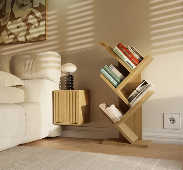 Świetny, dekoracyjny regał – zamiast zwykłej półki masz „drzewko”, które od razu robi klimat w pokoju. Małe gałązki fajnie trzymają książki, nic się nie przewraca, a całość zajmuje mało miejsca na podłodze.