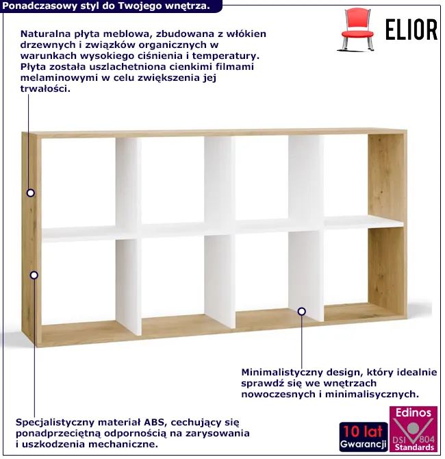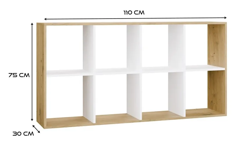 • Estetyka i funkcjonalność: Regał łączy w sobie nowoczesny design z praktycznym wykorzystaniem przestrzeni. Kwadratowe półki dodają mu oryginalnego charakteru.