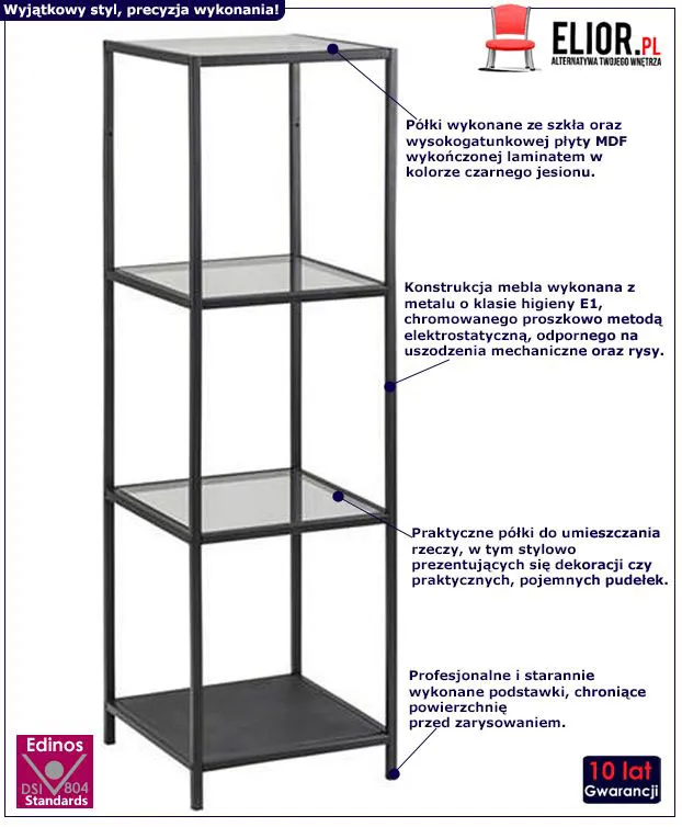 - Produkt posiada certyfikat jakości "Edinos Standards DSI 804", który potwierdza najwyższą jakość wykonania mebla oraz pełny stopień zgodności poszczególnych jednostek wytworzonego wyrobu z przyjętym wzorcem.