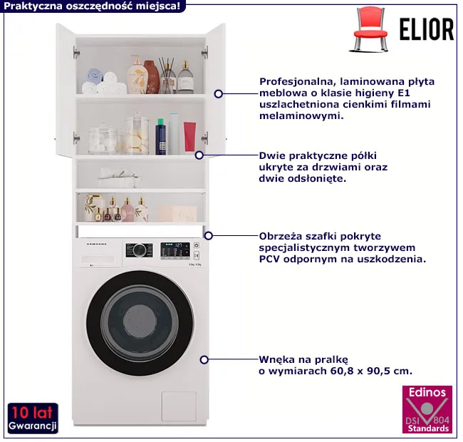 Czarująca i komfortowa w użytkowaniu szafka na pralkę do łazienki Defis to idealne rozwiązanie nie tylko dla niewielkich powierzchni. Wnęka na pralkę jest niezwykle praktyczna i umożliwia Ci zaoszczędzenie miejsca w łazience. Szafka Defis wykonana została z laminowanej płyty meblowej o klasie higieny E1, uszlachetnionej cienkimi filmami melaminowymi. Szafka na pralkę posiada także specjalne włókna ułożone różnokierunkowo o strukturze sinusoidalnej, co zapewnia nadanie jej cech jakościowych oraz wytrzymałościowych. Dla zwiększenia trwałości mebla, obrzeża szafki wykończono odpornym na uszkodzenia mechaniczne oraz chemiczne tworzywem PCV. Dwie półki schowane za drzwiczkami oraz dwie odsłonięte są wyjątkowo komfortowe i zapewniają wygodne przechowywanie wszystkich środków czystości, ręczników i kosmetyków. Stonowana kolorystyka i prosta forma sprawiają, że regał łazienkowy Defis doskonale sprawdza się we wnętrzach urządzonych w stylu skandynawskim, jak też minimalistycznym czy nowoczesnym. Stwórz w swoim domu niepowtarzalny klimat z szafką nad pralkę marki Elior!