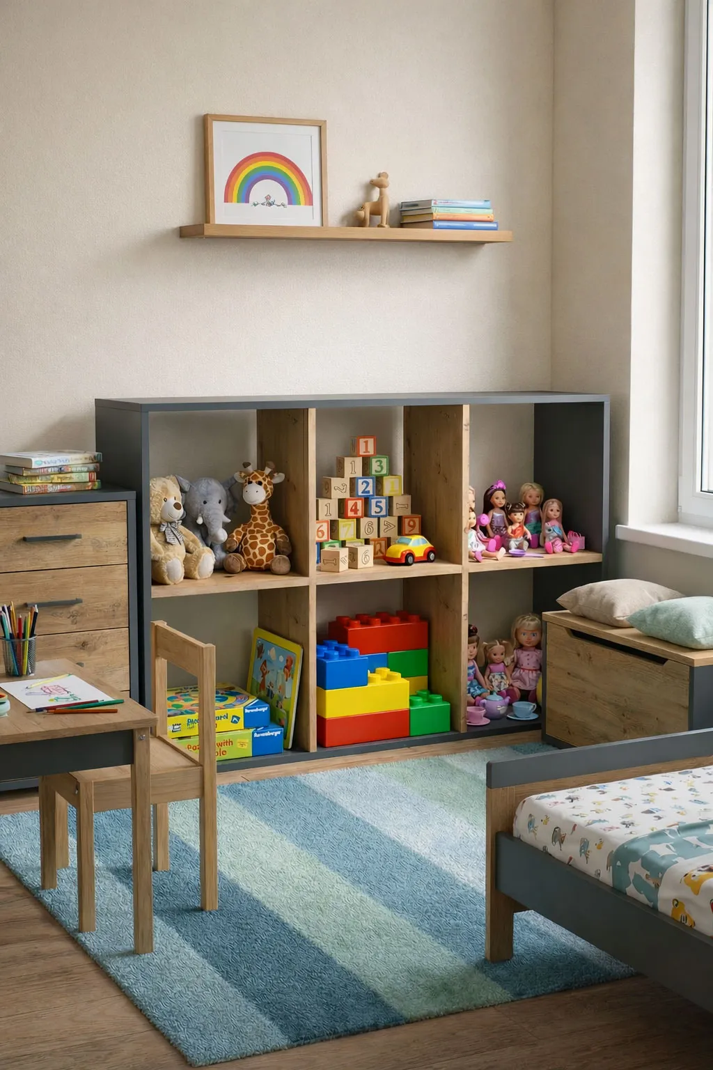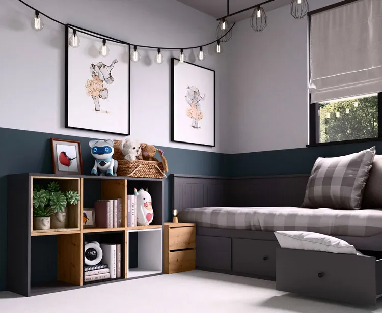 Zobacz jak prezentuje się regał na zabawki Atela 4X w przykładowym pokoju dziecięcym: