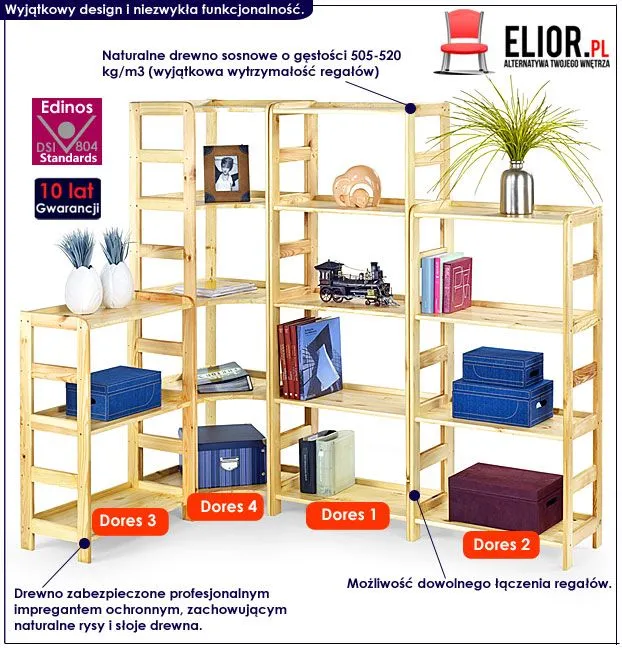 Całkowicie naturalny, designerski i komfortowy... dlaczego? Komfortowy regał Tunia 4 wyróżnia się nie tylko swoją praktyczną formą, ale także zastosowaniem materiałów najlepszej jakości. To dlatego cieszy się powodzeniem wśród osób lubiących nowatorskie rozwiązania. Mebel wykonany został w całości z prawdziwego drewna sosnowego. Uniwersalny i naturalny kolor sprawia, że świetnie dopasujesz je zarówno do Twojego nowoczesnego salonu czy sypialni, jak i do wnętrza dla dzieci oraz młodzieży. Regały Dores coraz częściej zamawiane są także do pomieszczeń gospodarczych, biur i warsztatów. Tylko jakość mebli marki Elior potwierdzona jest aż 10-letnią gwarancją! Odmień Swoje wnętrze już dziś i zaplanuj swój wymarzony "Kawałek Nieba"!