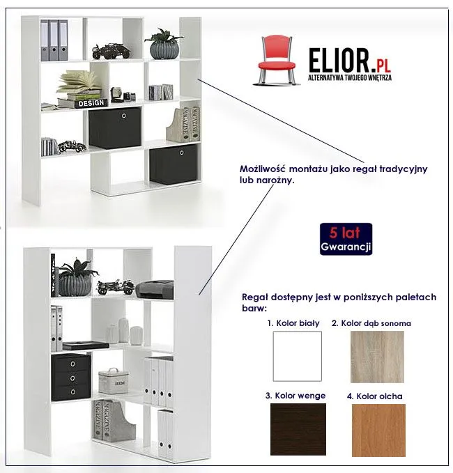 Absurdalnie supernowoczesny, designerski i komfortowy.. dlaczego? Komfortowy regał Cesaro 10X wyróżnia się nie tylko swoją praktyczną formą i ekstrawersyjnym kształtem, ale także zastosowaniem materiałów najlepszej jakości. To dlatego cieszy się powodzeniem wśród osób lubiących nowatorskie rozwiązania. Użyta do produkcji mebla naturalna płyta laminowana o objętości aż 93 dm3, została uszlachetniona i pokryta cienkimi filmami melaminowymi. Posiada także specjalne włókna ułożone różnokierunkowo, co zapewnia nadanie jej cech jakościowych oraz wytrzymałościowych. Uważaj na podobne produkty innych producentów, wykonane z importowanej, chińskiej i papierowej płyty MDF, które łamią się przy lekkim stuknięciu w korpus. Tylko jakość mebli marki Elior potwierdzona jest aż 5-cio letnią gwarancją! Odmień Swoje wnętrze już dziś i zaplanuj wymarzony "Kawałek Nieba"!