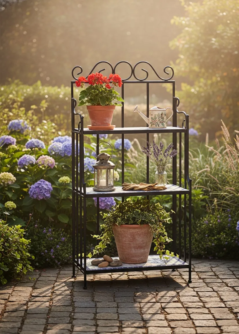 • Designerski regał ogrodowy na rośliny doniczkowe i dekoracje w śródziemnomorskim stylu.