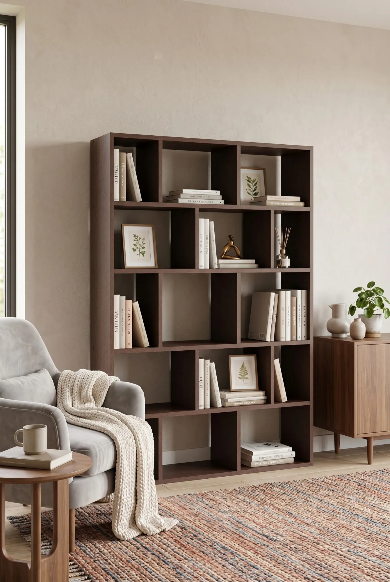 Aranżacja salonu z regałem otwartym w kolorze wenge Anika