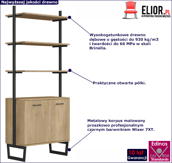 - Materiał: Regał wykonaliśmy z najwyższej jakości litego drewna dębowego o ponadprzeciętnej odporności na zarysowania i uszkodzenia mechaniczne. Nóżki i uchwyty to mocna stal malowana proszkowo, która jest odporna na korozję, chemikalia i wysoką temperaturę.