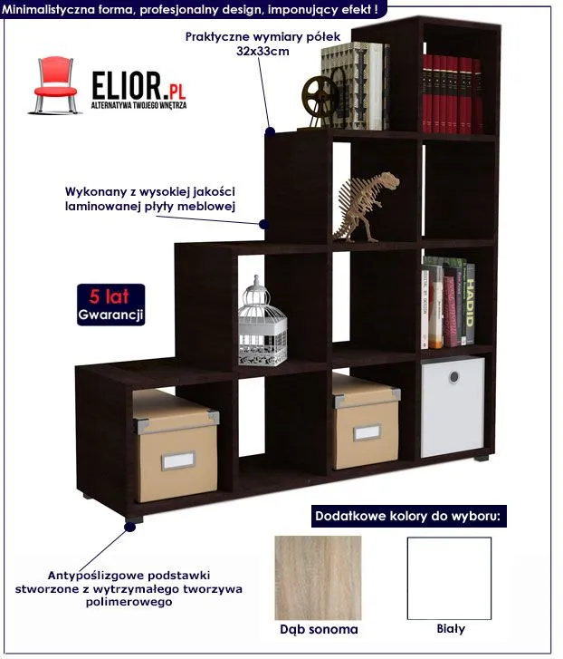 Absurdalnie supernowoczesny, designerski i komfortowy.. dlaczego? Komfortowy regał Cesaro 4X wyróżnia się nie tylko swoją praktyczną formą i ekstrawersyjnym kształtem, ale także zastosowaniem materiałów najlepszej jakości. To dlatego cieszy się powodzeniem wśród osób lubiących nowatorskie rozwiązania. Użyta do produkcji mebla naturalna płyta laminowana o objętości aż 93 dm3, została uszlachetniona cienkimi filmami melaminowymi. Posiada także specjalne włókna ułożone różnokierunkowo, co zapewnia nadanie jej cech jakościowych oraz wytrzymałościowych. Uważaj na podobne produkty innych producentów, wykonane z importowanej, chińskiej i papierowej płyty MDF, które łamią się przy lekkim stuknięciu w korpus. Tylko jakość mebli marki Elior potwierdzona jest aż 5-letnią gwarancją! Odmień Swoje wnętrze już dziś i zaplanuj wymarzony "Kawałek Nieba"!