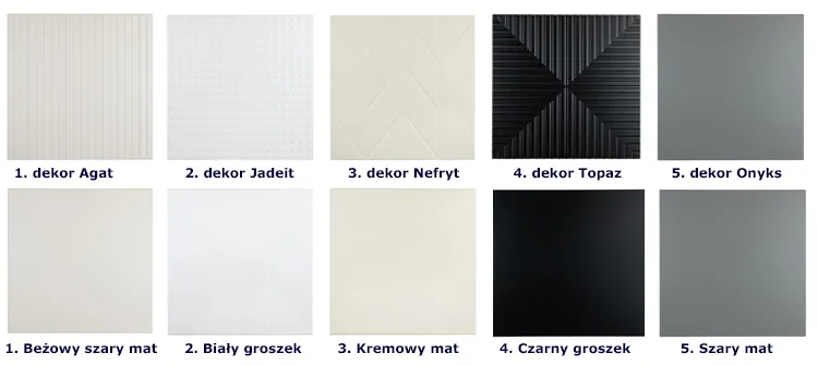 • Fronty szafek – 2 wymiary frontów w 5 wzorach inspirowanych urodą kamieni szlachetnych i 5 modnych kolorach. Ta opcja pozwoli Ci zdecydować, czy Twój mebel będzie zabudowany, otwarty czy półotwarty.
