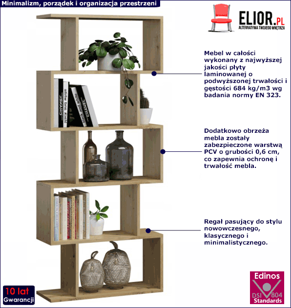 Prezentowany przez nas model regału charakteryzuje się minimalizmem i niebywałą możliwością organizacji przestrzeni. Mebel został wykonany z jednego materiału co nie powoduje wrażenia przesytu i przepychu w pomieszczeniach. Ponadto uniwersalna kolorystyka idealnie wkomponuje się w wystrój wnętrza Twojego domu w subtelny sposób podkreślając jego naturalny i delikatny akcent. Innowacyjny projekt to zaleta, która kryje w sobie niesymetryczny układ półek. Dzięki półkom oraz bocznych wysunięciach możesz znaleźć odpowiednie miejsce dla przedmiotów o różnej wielkości. Dodatkowym atutem są wymiary mebla oraz ułożenie półek na różnych wysokosciach, co pozwoli na korzystanie z niego osobom o różnym wzroście. Model regału o takich cechach idealnie odnajdzie się w salonie, domowej bibliotece, przedpokoju, sypialni lub pokoju dziecięcym i młodzieżowym. Dzięki niemu z pewnością każdy znajdzie idealne miejsce dla różnego rodzaju drobiazgów, ozdób, roślin i książek. Takie atuty pozwolą Ci na dopasowanie regału do pomieszczeń zaaranżowanych w stylu nowoczesnym, minimalistycznym i klasycznym.