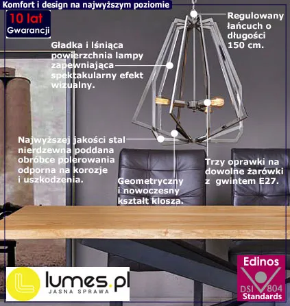 Jako marka, dbamy o najwyższą jakość zarówno pod względem wizualnym, jak i wykorzystanych materiałów. Do stworzenia lampy EX397-Modex użyliśmy modnego i trwałego surowca, jakim jest nierdzewna stal polerowana. Jest to niezwykle pożądany materiał ze względu na swoje właściwości wytrzymałościowe i wizualne. Wykazuje się niesamowitą odpornością na korozje i uszkodzenia mechaniczne. Podnosi to znacznie jej walory zarówno użytkowe jak i estetyczne. Jej błyszcząca, lustrzana powłoka pięknie odbija światło i sprawia, że lampa prezentuje się spektakularnie. Zawdzięcza to zawartości dużej ilości chromu, który zapewnia aż o 45 % większą odporność na uszkodzenia . Do jej polerowania wykorzystane zostały najnowocześniejsze techniki obróbki, dzięki którym powierzchnia stali jest idealnie gładka i lśniąca. Geometryczne kształty lampy podkreślają jej urok i wydobywają to, co najpiękniejsze. Charakterystyczny jest także ozdobny, regulowany łańcuch na którym wisi klosz, a jego długość to aż 150 cm! Niewątpliwie stanowi on o wyjątkowości lampy, która zwisając z sufitu otuli Twoje wnętrze swoją obecnością i oświetli go w ekskluzywny sposób. Jeśli więc chcesz zobaczyć ten efekt na własne oczy już dziś zainwestuj w najwyższą jakość i fenomenalny design!