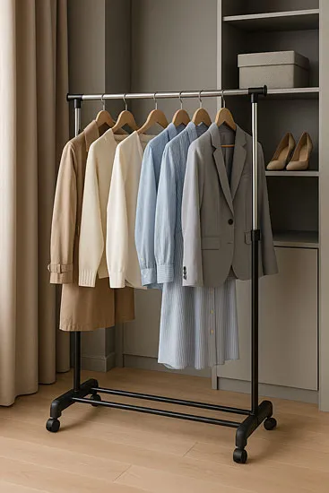 Mobilne kółka – przestawisz wieszak w dowolne miejsce bez wysiłku.