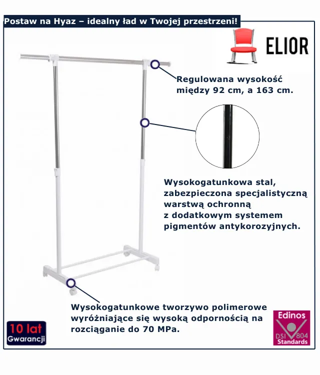 Wytrzymały drążek z zabezpieczeniem – ubrania nie zsuną się, nawet gdy zawiesisz ich więcej.
