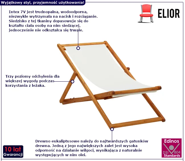 Składany leżak Celesta w kolorze białym marki Edinos Premium to doskonały wybór dla osób ceniących styl, trwałość i funkcjonalność. Wykonany z wytrzymałego drewna eukaliptusowego, leżak ten nie tylko wygląda elegancko, ale również jest odporny na warunki atmosferyczne. Dzięki trzem stopniom ustawienia odchylenia, możesz dostosować pozycję leżaka do swoich potrzeb, zapewniając sobie maksymalny komfort podczas relaksu. Dodatkowo, możliwość składania leżaka sprawia, że jest on łatwy w transporcie i przechowywaniu, co czyni go idealnym towarzyszem zarówno w ogrodzie, na tarasie, jak i podczas wypraw na plażę.