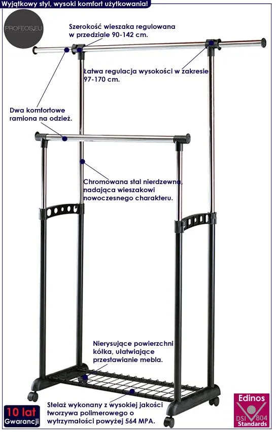 Poszukujesz funkcjonalnego, podłogowego wieszaka na ubrania do swojej garderoby? Wybierasz niebanalne rozwiązania w profesjonalnej jakości? Nie musisz marnować swojego czasu oraz wydawać astronomicznej kwoty na zakup masywnej, ciężkiej i niewygodnej w użytkowaniu szafy na ubrania Twojej rodziny. Idealnym wyborem jest najnowocześniejszy wieszak stojący Alicante 2X marki Edinos Premium. Możliwość łatwego przesunięcia go w dowolnie wybrane przez Ciebie miejsce, regulacja wysokości i szerokości oraz promocyjna cena to tylko niektóre z jego niezliczonych zalet. Chcesz wiedzieć więcej? Zapraszamy do zapoznania się z opisem tego fascynującego wieszaka podłogowego!