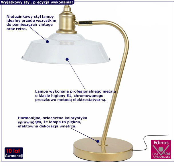 Nasze nowoczesne mieszkania staramy się urządzać przede wszystkim komfortowo i funkcjonalnie. Szukamy do nich wygodnych mebli, służących nam na lata dokładnością wykonania, trwałością, starannością. W końcu w swoich kątach chcemy czuć się swobodnie, naturalnie, wygodnie – po prostu jak najlepiej. Ale nasze wnętrza tworzą spójną, komfortową całość nie tylko dzięki takim meblom, jak miękka sofa, wygodny stolik kawowy czy tapicerowane krzesła. W nowoczesnym, komfortowo i przemyślanie zaprojektowanym mieszkaniu nie może zabraknąć stylowej, cechującego się szlachetnością formy lampy stołowej! Na szczęście powstała retro lampa Sigurd! To piękna propozycja idealna do wielu nowoczesnych wnętrz. Jakże doskonale ta nietypowa lampa stołowa wpisuje się w panujące obecnie trendy! To, co wyróżnia vintage lampę Sigurd spośród innych lamp, to na pewno staranne, precyzyjne wykonanie. To właśnie ono nadaje stylizowanej na meble z zeszłej epoki lampie Sigurd szlachetnego wyglądu. Ponadczasowe, eleganckie złoto idealnie łączy się tu z dominującym kolorem lampy. To właśnie sprawia, że nowoczesna lampa stołowa i nocna Sigurd to po prostu świetna, nigdy niewychodząca z mody dekoracja wnętrza! Szykowna, interesująca wizualnie lampa Sigurd pasuje do wielu różnorodnych przestrzeni. Zarówno w domu i mieszkaniu, jak i w miejscach o komercyjnym charakterze wyjątkowa lampa Sigurd sprawdzi się wręcz doskonale. Vintage gabinet? Klasyczny przedpokój? Retro zaprojektowana sypialnia? Designerska recepcja? Kawiarnia w stylu eklektycznym? A może nietypowo urządzony salon kosmetyczny? Z funkcjonalną, szlachetną lampą stołową Sigurd szykowne wnętrze to żaden problem! Harmonijna, efektowna lampa Sigurd bez trudu nada Twoim przestrzeniom charakteru, który znakomicie wpisuje się w panujące obecnie aranżacyjne trendy – ekstrawagancję, klasę i modernistyczny szyk.