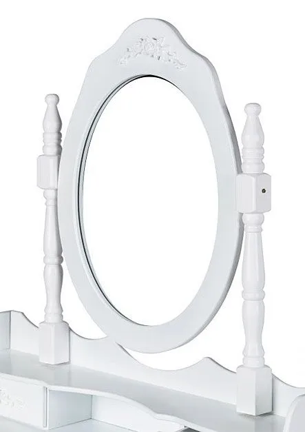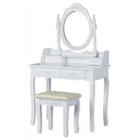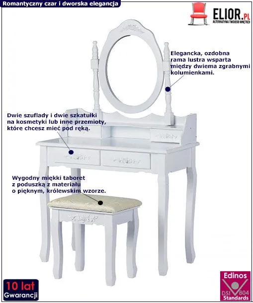 • Wspaniały dworski wygląd: biały kolor, kształtne nogi mebla i ozdobne lustro z ramą z kolumienkami - zobacz też inne modele toaletek z naszej oferty, na pewno znajdziesz coś dla siebie