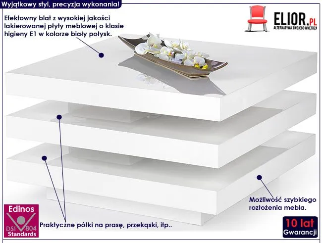 Komfortowa i efektowna ława Debbie wyróżnia się nie tylko swoją oryginalną formą i praktycznym kształtem, ale także wyjątkową precyzją wykonania. To dlatego cieszy się ona powodzeniem wśród osób ceniących niebanalne rozwiązania. Efektowna konstrukcja stolika w kolorze biały połysk wykonana została z lakierowanej płyty meblowej o klasie higieny E1, uszlachetnionej cienkimi filmami melaminowymi. Posiada także specjalne włókna ułożone różnokierunkowo o strukturze sinusoidalnej, co zapewnia nadanie jej cech jakościowych oraz wytrzymałościowych. Dzięki szybkiej i prostej możliwości rozłożenia mebla, zyskujesz dodatkowe miejsce na nakrycia czy przekąski w przypadku niezapowiedzianej wizyty gości. Stonowana kolorystyka i prosta forma sprawiają, że stolik kawowy Debbie doskonale sprawdza się we wnętrzach urządzonych zarówno w stylu minimalistycznym, jak też skandynawskim czy nowoczesnym. Wykończenie mebla w pełnym połysku optycznie powiększa i rozświetla każde pomieszczenie. Ława Elior dodaje wnętrzu harmonii i modnego designu, a każdy łyk kawy przy niej wypity pozwala Ci odetchnąć od codziennego zgiełku i pośpiechu. Nadaj Twojemu wnętrzu wyrazistego designu, harmonizując go z czystością prawdziwej bieli!