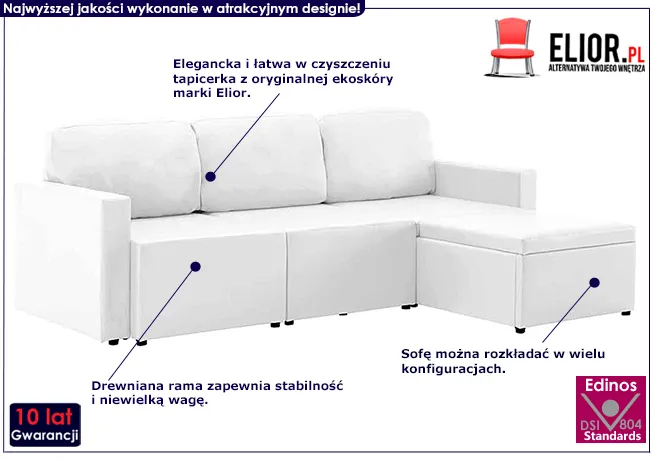 Designerska tapicerka wykonana została z najwyższej jakości ekoskóry (skóry ekologicznej), łatwej do utrzymania w czystości. Ekoskóra używana przy produkcji mebli marki Edinos Premium jest o wiele bardziej odporna na słońce oraz substancje płynne , co pozwala Ci na długie i bezpieczne użytkowanie. Już nie musisz się martwić, że rozlana kawa spowoduje konieczność wymiany mebla. Skóra ekologiczna została pokryta warstwą polichlorku winylu. Do produkcji ramy wykorzystaliśmy drewno sosnowe. Nie naładowuje się ono statyczną energią elektryczną, dzięki czemu nie przyciąga do swojej powierzchni kurzu, który mógłby się na niej kumulować i następnie tworzyć zawirowania w powietrzu.Docenią to alergicy. Wypełnienie oparcia i siedziska to głównie PVC. Posiada ono niezwykłe właściwości termoplastyczne, dużą wytrzymałość mechaniczną, odporność na działanie wielu rozpuszczalników i czynniki biologiczne.