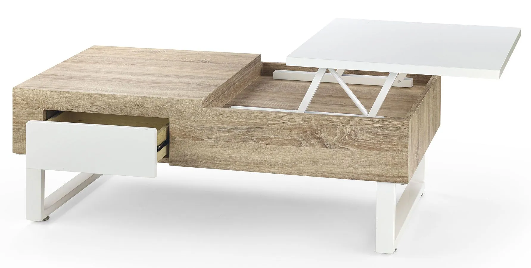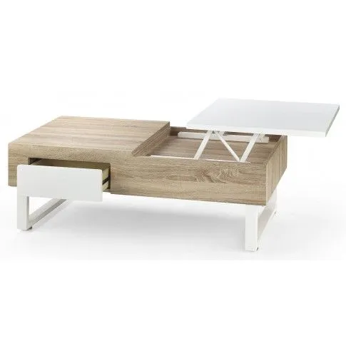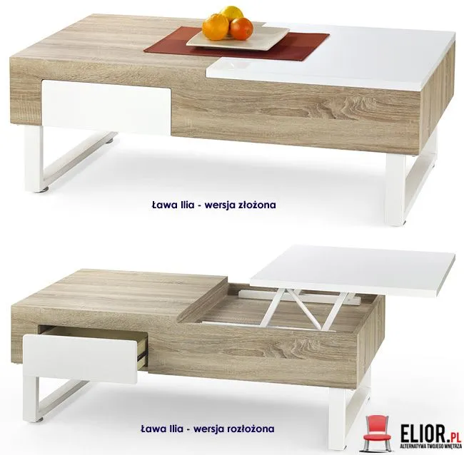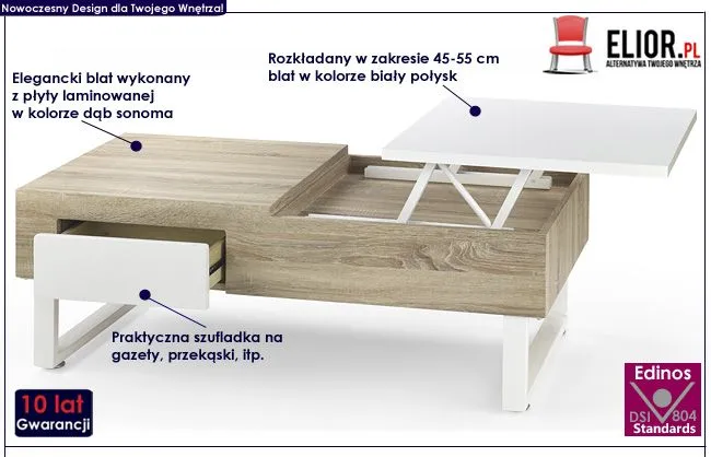 Komfortowa i czarująca ława Emla wyróżnia się nie tylko swoją praktyczną formą i eleganckim kształtem, ale także zastosowaniem materiałów najlepszej jakości. To dlatego cieszy się ona powodzeniem wśród osób lubiących niebanalne rozwiązania i szybko zyskała status bestsellera. Wygodna w formie konstrukcja ławy wykonana została z wysokiej jakości płyty laminowanej w kolorze dąb sonoma, uszlachetnionej cienkimi filmami melaminowymi. Posiada także specjalne włókna ułożone różnokierunkowo, co zapewnia nadanie jej cech jakościowych oraz wytrzymałościowych. Rozkładany blat w pełnym połysku wyprodukowano z lakierowanej płyty w kolorze białym oraz stali malowanej proszkowo metodą elektrostatyczną (najwyższa technika polimeryzacji). Praktyczny schowek na niezbędne drobiazgi pomaga Ci zaoszczędzić miejsce na blacie i utrzymać na nim porządek. Ława Emla dodaje wnętrzu harmonii i uroku, a każda kawa przy niej wypita smakuje doskonale. Podaruj Twoim czterem kątom nieco naturalnego ciepła, harmonizując je z czystością delikatnych kolorów.