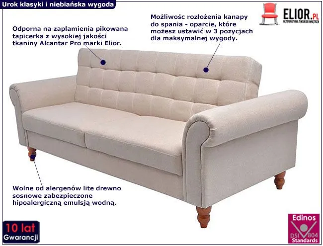 Carpon 4K marki Elior to propozycja wychodząca naprzeciw dwu potrzebom: posiadania typowego ładnego mebla wypoczynkowego na co dzień oraz miejsca do spania.  Za dnia będzie uszlachetniała i łagodnie dopełniała  wnętrze salonu swoim pełnym gracji kształtem i apetycznym kremowym kolorem. Wieczorem zaś możesz ją rozłożyć, uzyskując w ten sposób łóżko - dla siebie lub gości. Jako kanapa, Carpon 4K ma dwie opcje nachylenia oparcia + możliwość rozłożenia na płasko do spania. Solidne nogi i rama z drewna sosnowego zapewniają natomiast solidność i trwałość obiecującą satysfakcję na długie lata.