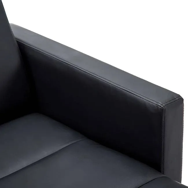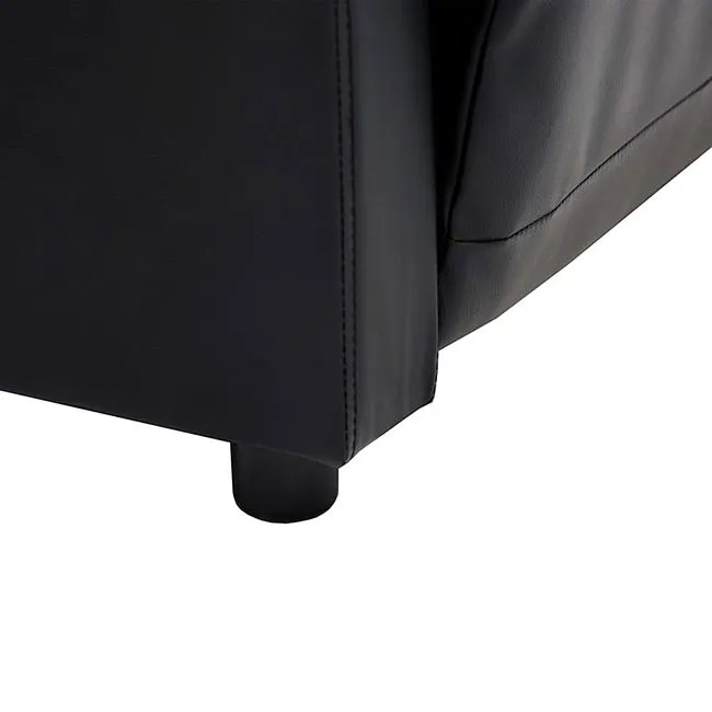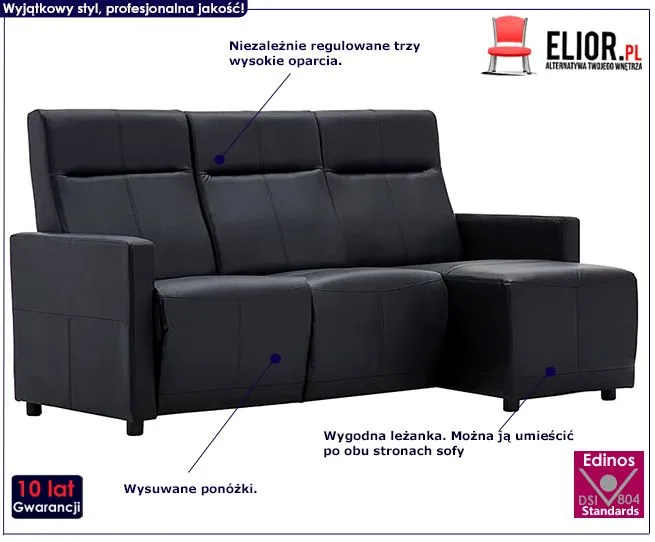 Designerska tapicerka w czarnym kolorze wykonana została z najwyższej jakości ekoskóry (skóry ekologicznej), łatwej do utrzymania w czystości. Ekoskóra używana przy produkcji mebli marki Elior jest o wiele bardziej odporna na słońce oraz substancje płynne , co pozwala Ci na długie i bezpieczne użytkowanie. Już nie musisz się martwić, że rozlana kawa spowoduje konieczność wymiany mebla. Skóra ekologiczna została pokryta warstwą polichlorku winylu. Drewniana rama zapewnia stabilność i niską wagę sofy, co ułatwia jej przemieszczanie. Dla zwiększenia wygody siedziska wypełnia gruba warstwa specjalnej mieszanki bawełny, poliestru i PCV.
