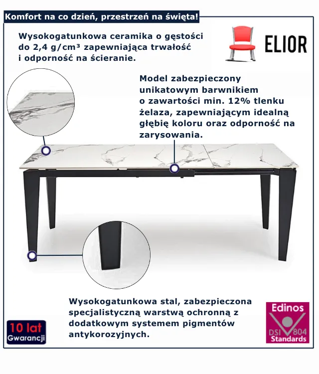 Wybierając stół Drix marki Edinos Premium, decydujesz się na mebel, który będzie służył Ci przez lata. To połączenie praktyczności z designerskim wyglądem, które zmieni sposób, w jaki korzystasz z przestrzeni. Nie czekaj – ciesz się stołem idealnie dopasowanym do Twojego życia za jedyne 2638 zł!