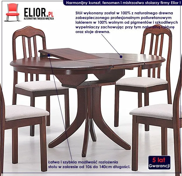 Stół to centralny mebel Twojego wnętrza. Mogą dziać się przy nim rzeczy piękne, czarodziejskie i fascynujące. Niestety Twój stół usłyszy kiedyś także inne reakcje emocjonalne jak chociażby gniew, przygnębienie czy rozdrażnienie. Zadbaj więc o to, aby ten najważniejszy mebel Twojego domu godnie znosił wszystkie panujące u Ciebie myśli, nastroje i emocje. Postaw na profesjonalny produkt znanego producenta, który jako jedyny na rynku oferuje Ci aż 5 lat gwarancji i niebywale ekscytujący design, wykonany w 100% z litego drewna. Zakochasz się w nim od pierwszego wejrzenia.