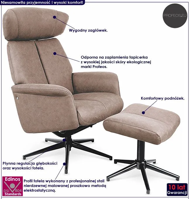 Komfortowy fotel z podnóżkiem Starius wyróżnia się nie tylko swoją unikalną formą, ale także zastosowaniem materiałów najlepszej jakości. Tapicerka mebla pokryta została wysokiej jakości ekoskórą (skórą ekologiczną), łatwą do utrzymania w czystości. Ekoskóra używana przy produkcji mebli marki Profeos jest o wiele bardziej odporna na słońce oraz substancje płynne , co pozwala Ci na długie i bezpieczne użytkowanie. Rozlana kawa nie sprawi Ci już kłopotu i nie spowoduje konieczności wymiany mebla. Skóra ekologiczna marki Profeos została pokryta warstwą polichlorku winylu. Profil mebla w kolorze czarnym wykonany został z najwyższej jakości nierdzewnej stali malowanej proszkowo odpornym na zarysowania i zadrapania. Najwyższa jakość techniki polimeryzacji pozwoliła zaoferować firmie Profeos aż 10 lat gwarancji na swoje produkty. Już nie musisz się martwić, że po kilku latach część farby odpryśnie od mebla .