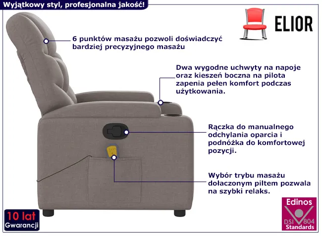 • praktyczna kieszeń na boku fotela pozwala na łatwy dostęp do pilota i innych drobiazgów, które chcesz mieć pod ręką.
