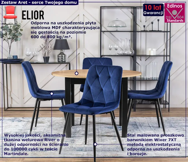 • Kolor: stół: dąb riviera+czarny; krzesła: granatowy.
