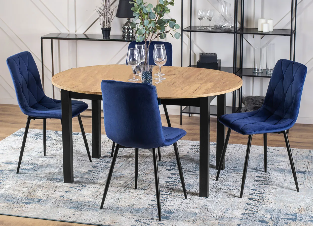 • okrągły blat stołu w kolorze dąb riviera idealnie łączy się z czarnymi nogami i pięknymi, granatowymi krzesłami, tworząc zachwycającą całość