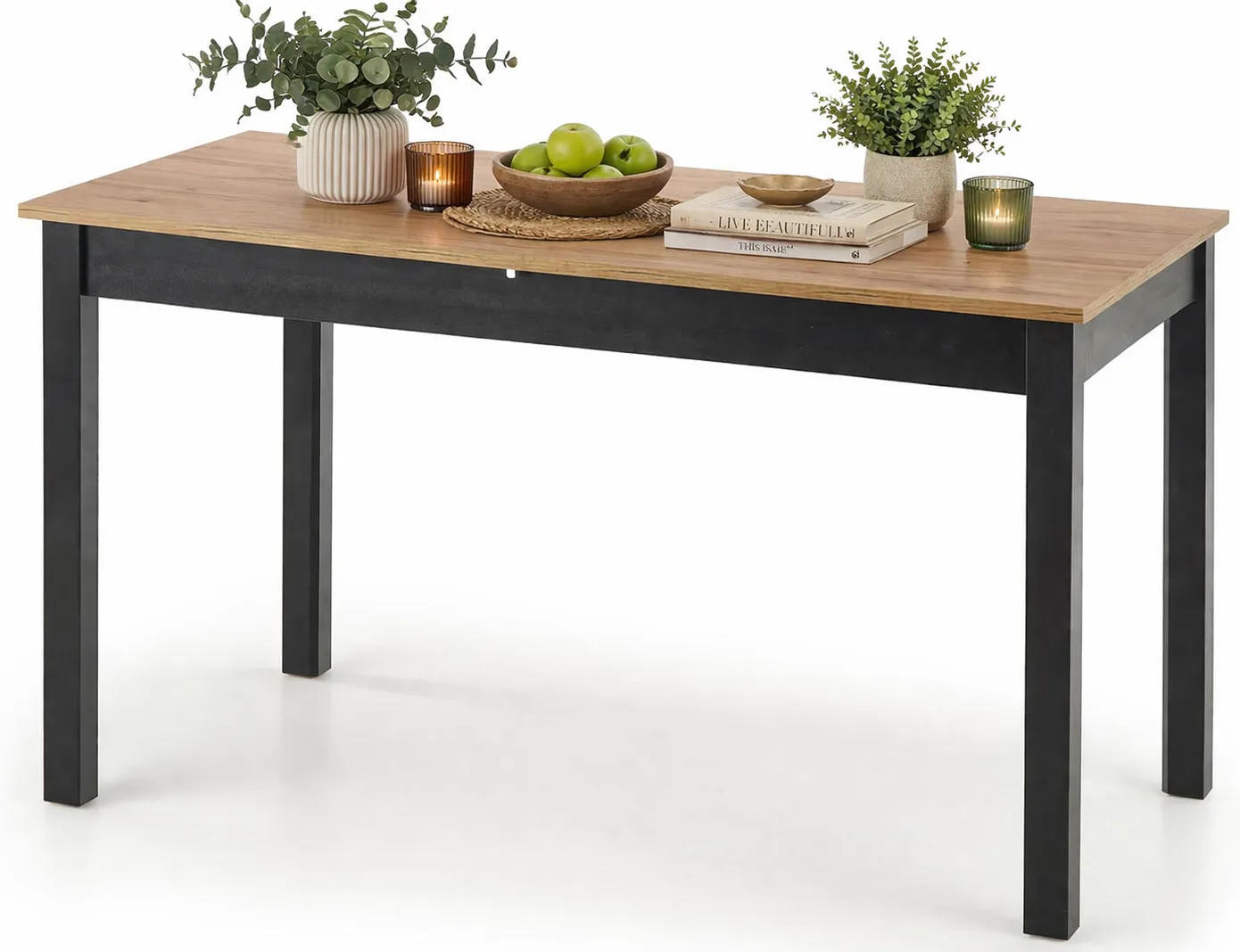 Industrialny, prostokątny stół Lumos to projekt wykonany z myślą o osobach, które nie lubią zadowalać się bylejakością. Starannie dobrane materiały połączone w doskonałą całość pod okiem najlepszych specjalistów marki Edinos Premium tworzą mebel, który z dumą zadba o doskonały wygląd Twojej aranżacji. Blat w kolorze dębu wotan w umiejętny sposób podkreślony został czarną, szykowną podstawą, dzięki czemu wprowadzi do aranżacji szczyptę zdecydowania. Dzięki funkcji rozkładania stół Lumos nie zajmie w urządzanym przez Ciebie wnętrzu zbyt wiele miejsca, a podczas rodzinnej kolacji lub wizyty niezapowiedzianych gości zmieści absolutnie każdego. Jest on idealnym rozwiązaniem zarówno do salonu, jadalni jak i kuchni. Nowoczesny styl stołu Lumos sprawi, że aranżacja Twojego wnętrza nabierze całkowicie nowego, designerskiego charakteru. Postaw na świeży i niepowtarzalny design!