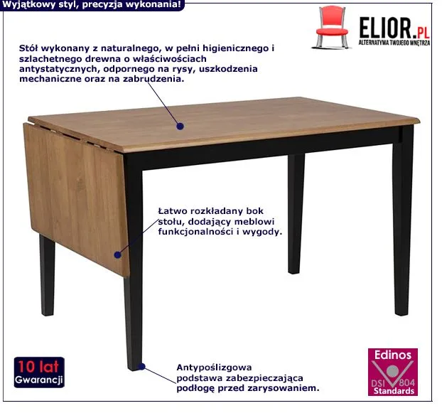 Funkcjonalnie zaprojektowany stół Dorra z najnowszej kolekcji Elior.pl zachwyca gustowną, naturalną a zarazem ponadczasowej klasy formą. Ten designerski projekt meblowy wpisujący się w najnowsze aranżacyjne trendy może spokojnie zdobić zarówno loftowo zaprojektowane mieszkanie, jak i komercyjne przestrzenie o skandynawskiej, loftowej czy minimalistycznej stylistyce. Nic w tym dziwnego - jakże wygodny w użytkowaniu i przepięknie wykonany stół Stylowy Astron należy do totalnych unikatów pod względem wizualnym, choć jest zarazem prosty i surowy formą. Dorra posiada ciekawie i jakże funkcjonalnie rozładany blat, dzięki czemu uzykujemy o wiele więcej miesca, gdy tego potrzebujemy. Prostokątny, szeroki blat w szlachetnym kolorze naturalnego drewna został tutaj dopełniony stabilną podstawą w takim czarnym kolorze. Dzięki niemu stół cechuje wizualna klasa, ale w taka niezobowiązującym, modernistycznym wydaniu. Właśnie tego typu projekty meblowe cieszą się obecnie ogromną popularnością wśród dekoratorów wnętrz. Piękno tkwiące w prostocie i surowości formy połączone z naturalną, harmonijną kolorystyką? Tak właśnie prezentuje się interesujący stół z rozkładanym blatem Dorra w skandynawskiej i industrialnej odsłonie!