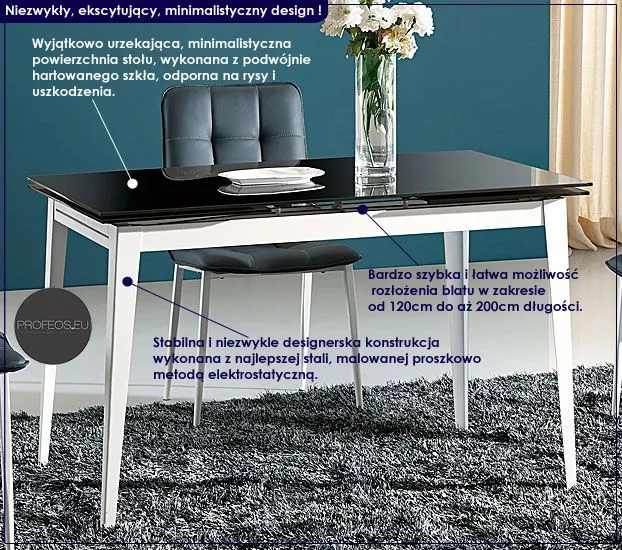Stół to centralny mebel Twojego wnętrza. Mogą dziać się przy nim rzeczy piękne, czarodziejskie i fascynujące. Niestety Twój stół usłyszy kiedyś także inne reakcje emocjonalne jak chociażby gniew, przygnębienie czy rozdrażnienie. Zadbaj więc o to, aby ten najważniejszy mebel Twojego domu, godnie znosił wszystkie panujące u Ciebie myśli, nastroje i emocje. Postaw na profesjonalny produkt znanego producenta, który jako jedyny na rynku oferuję Ci aż 5 lat gwarancji i niebywale ekscytujący design. Zakochasz się w nim od pierwszego wejrzenia.