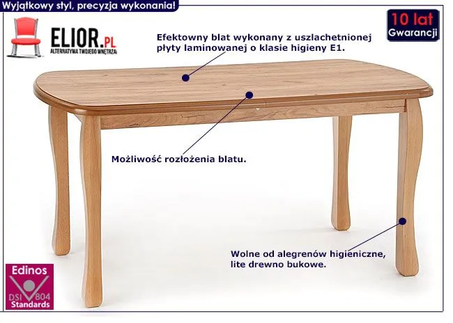 Najważniejsza w wyborze odpowiedniego stołu jest jego jakość, ponieważ stół to inwestycja na lata. Jest to mebel, który jest w nieustannym użytkowaniu i ma kontakt z różnego rodzaju płynami oraz posiłkami, a więc musi być odporny. Diron zaprojektowany przez markę Elior jest stworzony ze starannie wyselekcjonowanych i doskonale dobranych produktów meblarskich. Przestronny blat wykonany jest z profesjonalnej płyty laminowanej o klasie higieny E1 odpornej na uszkodzenia. Posiada także specjalne włókna ułożone różnokierunkowo o strukturze sinusoidalnej, co zapewnia nadanie jej cech jakościowych oraz wytrzymałościowych. Zastosowana technologia sprzyja utrzymywaniu mebla w czystości. Stabilne nogi stołu to wolne od alergenów, higieniczne lite drewno bukowe. Diron nie zajmuje dużo miejsca, a jednocześnie posiada możliwość rozłożenia blatu. Za pomocą wygodnej prowadnicy wraz z rolką, możesz szybko rozłożyć blat stołu o długości 150 cm do aż 190 cm. Już nie musisz martwić się o brak miejsca przy stole na kolejnej, domowej imprezie. To komfortowy mebel idealny do towarzyskich spotkań przy obiedzie, wspólnych gier i zabaw, a nawet do nauki czy pracy. Już dziś nadaj Twojemu wnętrzu harmonii i stylowego designu z najnowszym stołem Diron!