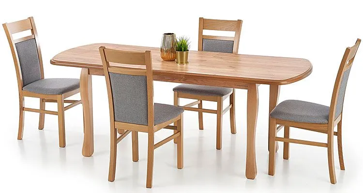 Bardzo delikatny design, zaokrąglony i schludny, po rozłożeniu całkiem duży stół, odcień pasuje wszędzie. Drewno bukowe jest klimatyczne szczególnie w otoczeniu trzaskającego kominka.