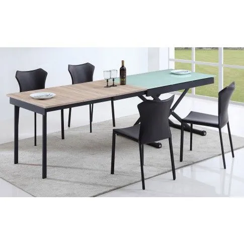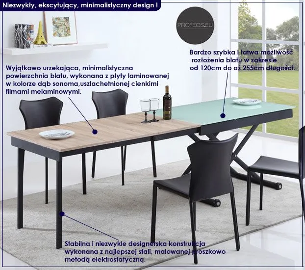 Doskonały, niebanalny i mocno wyrazisty design oraz maksymalna praktyczność wykorzystania mebla. Stół Savixo o długości 120 cm w kilka minut rozłożysz aż do długości 255 cm. Sprawdź ofertę firmy Profeos i zobacz pokaz najnowszego stołu Savixo. Zachwycający styl i fenomenalny, mistrzowski urok pozwoli Ci w końcu odpocząć od codziennego wyścigu. Harmonijne połączenie pełnego szkła, naturalnej płyty laminowanej oraz modnej minimalistycznej konstrukcji, świetnie wkomponuje się w każde urządzone z pasją pomieszczenie. Wyobraź sobie już dziś, jak efektownie eksponowałby się w Twoim wnętrzu...