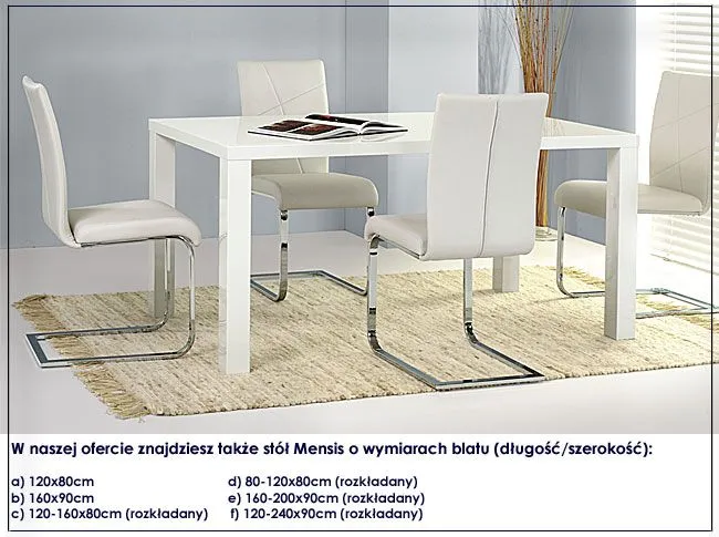 Stół Mensis marki Elior oferujemy Ci w aż sześciu różnych rozmiarach blatu, jak też w kolorze popielaty połysk. Kliknij tutaj i zobacz inne wymiary i kolor stołu dla tego modelu.
