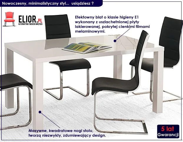 Stół to centralny mebel Twojego wnętrza. Mogą dziać się przy nim rzeczy piękne, czarodziejskie i fascynujące. Niestety Twój stół usłyszy kiedyś także inne reakcje emocjonalne jak chociażby gniew, przygnębienie czy rozdrażnienie. Zadbaj więc o to, aby ten najważniejszy mebel Twojego domu, godnie znosił wszystkie panujące u Ciebie myśli, nastroje i emocje. Postaw na profesjonalny produkt znanego producenta, który jako jedyny na rynku oferuje Ci aż 5 lat gwarancji i niebywale ekscytujący design. Zakochasz się w nim od pierwszego wejrzenia. Mebel świetnie nadaje się do kuchni, jadalni lub salonu. Minimalistyczna forma stołu, bez zbędnego przerostu formy na treścią z pewnością przykuje oko niejednego gościa. Skończ z monotonią polskich meblościanek. Zrób duży krok w przyszłość i kreuj swoje wnętrze tak jak chcesz.