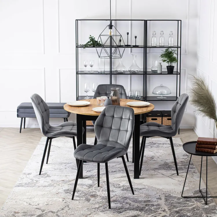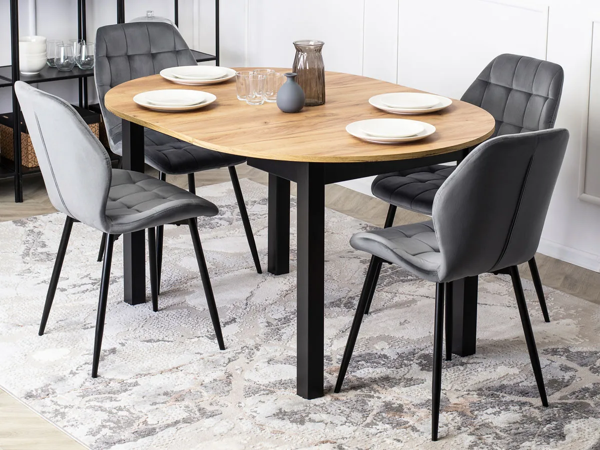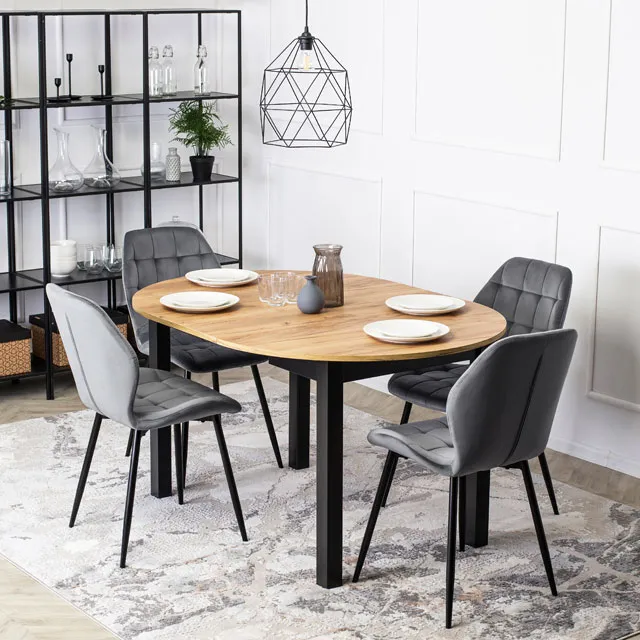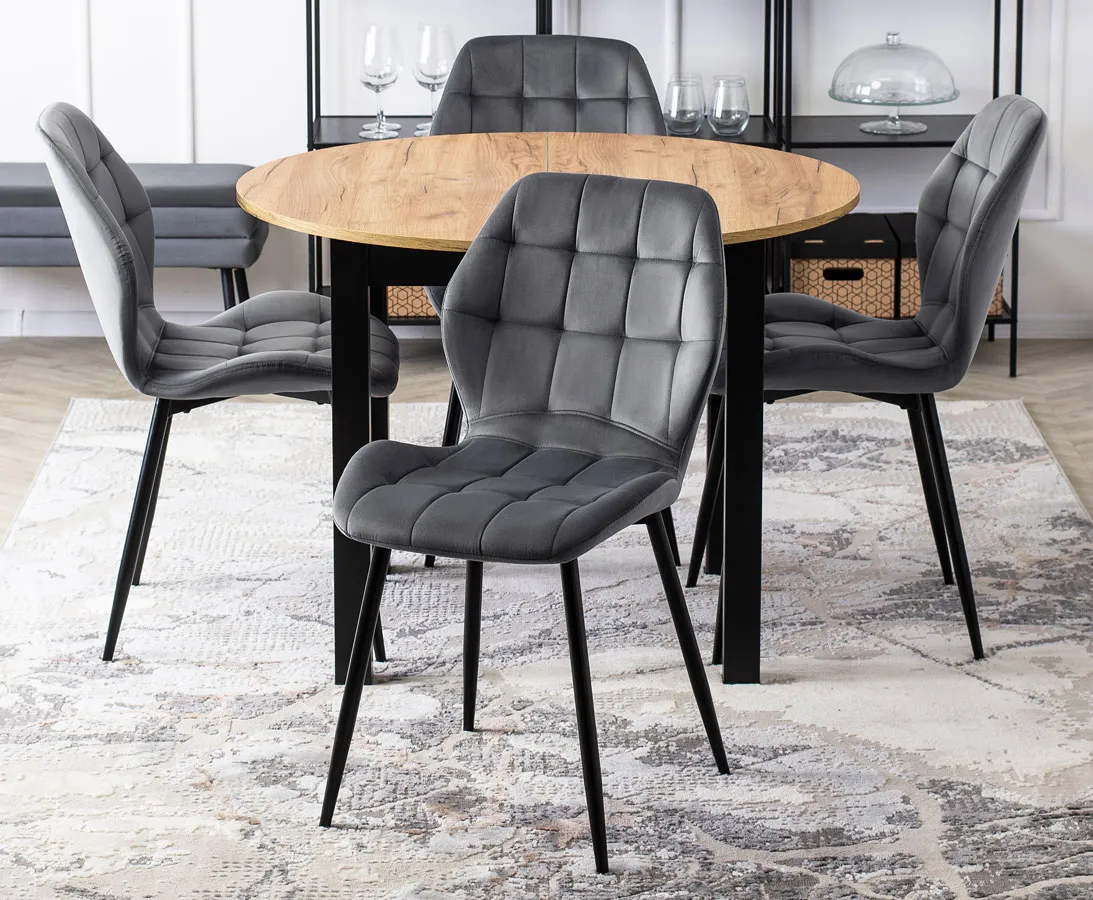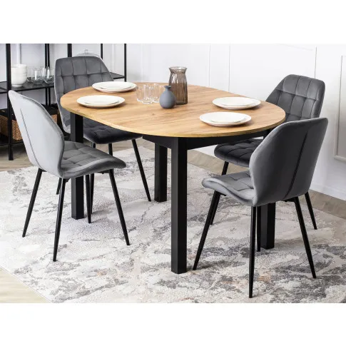 • okrągły blat stołu w odcieniu dębu craft idealnie łączy się z czarnymi nogami i szarymi krzesłami tworząc estetycznie zachwycającą całość