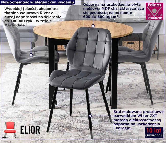 • tapicerka krzeseł to wysokiej jakości tkanina welurowa należąca do francuskich welwetów odporna na ścieranie do do 100000 cykli w teście Martindale