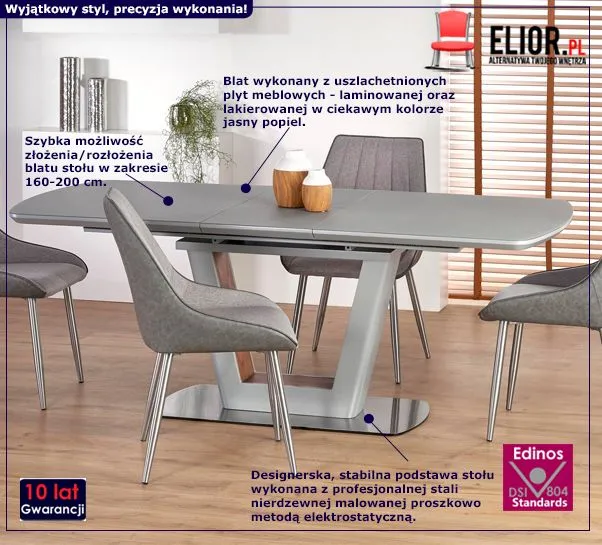Rewelacyjnie i jakże profesjonalnie zaprojektowany stół Ilmila z najnowszej kolekcji Elior.pl zachwyca gustowną, pełną pomysłowości a zarazem ponadczasowej klasy formą. Ten designerski projekt meblowy wpisujący się w najnowsze aranżacyjne trendy może spokojnie zdobić zarówno wyrafinowanie zaprojektowane mieszkanie, jak i komercyjne przestrzenie o loftowej czy kolonialnej stylistyce. Nic w tym dziwnego - jakże wygodny w użytkowaniu i przepięknie wykonany stół Ilmila należy do totalnych unikatów pod względem wizualnym. Prostokątny, gładki i matowy blat w nietypowym, jasno grafitowym wydaniu został tu dopełniony stalową podstawą w szaro - orzechowym kolorze. Dzięki takiemu kolorystycznemu zestawieniu Ilmila cechuje elegancja i nowoczesny szyk. Właśnie tego typu projekty meblowe cieszą się obecnie ogromną popularnością wśród dekoratorów wnętrz. Minimalistyczna elegancja, piękno tkwiące w prostocie formy a do tego subtelna nonszalancja wynikająca ze starannie dobranych barw… No właśnie, to wszystko sprawia, że pełen modernizmu i nowoczesnej nonszalancji stół Ilmila zachwyca wciąż na nowo.
