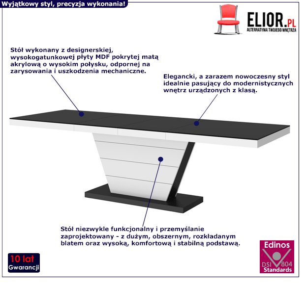 - Produkt posiada certyfikat jakości "Edinos Standards DSI 804", który potwierdza najwyższą jakość wykonania mebla oraz pełny stopień zgodności poszczególnych jednostek wytworzonego wyrobu z przyjętym wzorcem.
