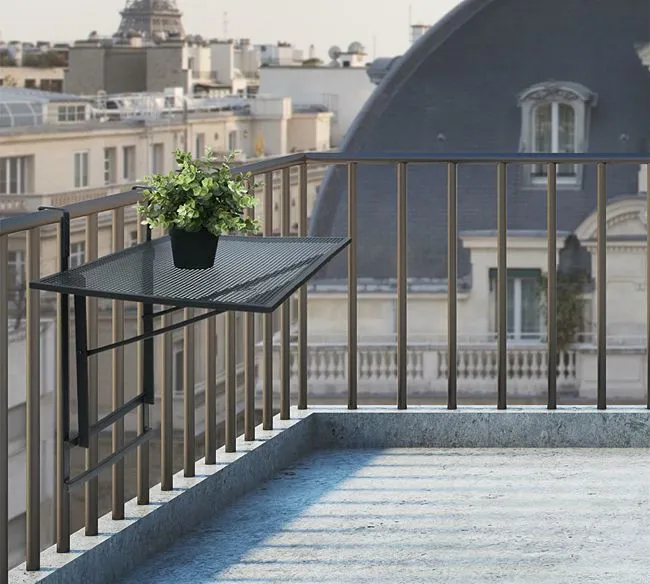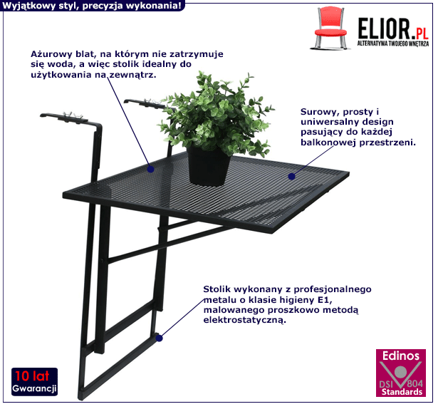 Stolik na balkon, który prezentuje się nowocześnie i modnie, a zarazem uniwersalnie i ponadczasowo? Praktyczny, funkcjonalny i pomysłowo zaprojektowany? To oczywiście nasz wyjątkowy stolik rozkładany Sintrev! Ten balkonowy mebel zachwyca wygodną w użytkowaniu, sprytnie zaaranżowaną formą. Stolik Sintrev mocuje się na balkonowej barierce i po prostu rozkłada. Gdy nie jest potrzebny, można go wygodnie złożyć, a wtedy nie zajmuje on cennego na każdym balkonie miejsca. Po rozłożeniu otrzymujemy ażurowy blat, na którym bez trudu pomieści się nasze śniadanie! Sintrev to mebel totalnie nowoczesny, ponieważ przede wszystkim praktyczny w użytkowaniu. Czarny kolor mebla sprawia, że stolik doskonale pasuje niemalże wszędzie. Jeśli szukasz praktycznych, ponadczasowych i zgrabnych mebli na balkon, to postaw na fantastyczny stolik kawowy Sintrev!