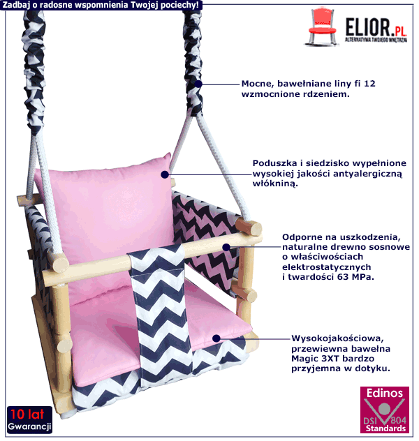 Jako odpowiedzialna i doświadczona marka zdajemy sobie sprawę, że najważniejszym aspektem przy produkcji dziecięcego asortymentu jest bezpieczeństwo. Dlatego do stworzenia huśtawki Vilan wykorzystaliśmy jedynie wyselekcjonowane surowce. Fundamentem jest naturalne drewno sosnowe, które charakteryzuje się twardością na poziomie aż 63 MPa w pomiarach Janki. Dzięki temu wykazuje dużą odporność na wszelakie uszkodzenia mechaniczne. Drewno sosnowe ma także zbawienny wpływ na zdrowie, ponieważ posiada właściwości elektrostatyczne oraz reguluje poziom wilgotności powietrza. Obszycie huśtawki to wysokiej jakości bawełna Magic 3XT. Jako naturalna tkanina nie uczula, zapewnia przewiewność oraz jest bardzo przyjemna w dotyku. Aby zapewnić maksimum komfortu i bezpieczeństwa Twojemu maluchowi, wypełnienie poduszek stanowi wysokojakościowa, antyalergiczna włóknina. Ponad to, bawełniane liny wzmocnione zostały rdzeniem. Masz więc pewność, że huśtawka Vilan jest w pełni przyjazna i bezpieczna dla Twojego dziecka. Postaw na polską, najwyższą jakość!